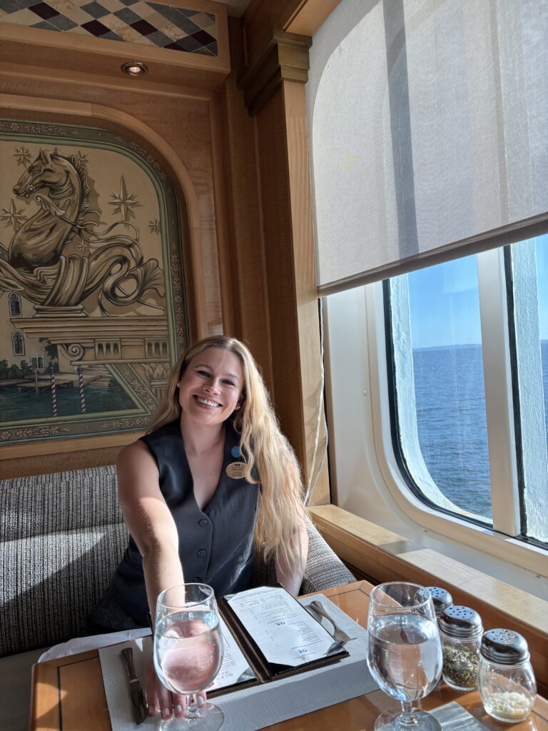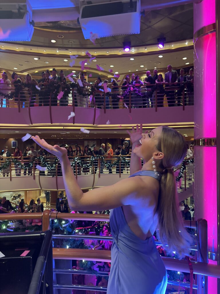 Embarking on the ship in Fort Lauderdale, FL, I faced a whirlwind of new experiences. From figuring out how to fit my whole life into a tiny cabin with two bunk beds and one roommate to learning my emergency responsibilities as a crew member, it took time to adjust onboard, which is the case whether it’s your first contract or your fifth. Things I normally wouldn’t have thought twice about on land, such as how to dispose of my trash or make phone calls, all became a bit more complicated, not to mention constantly getting lost on the 18-deck ship until I learned my way around. But with the support of my cast, which basically acted as my family onboard, navigating my new home eventually became second nature.